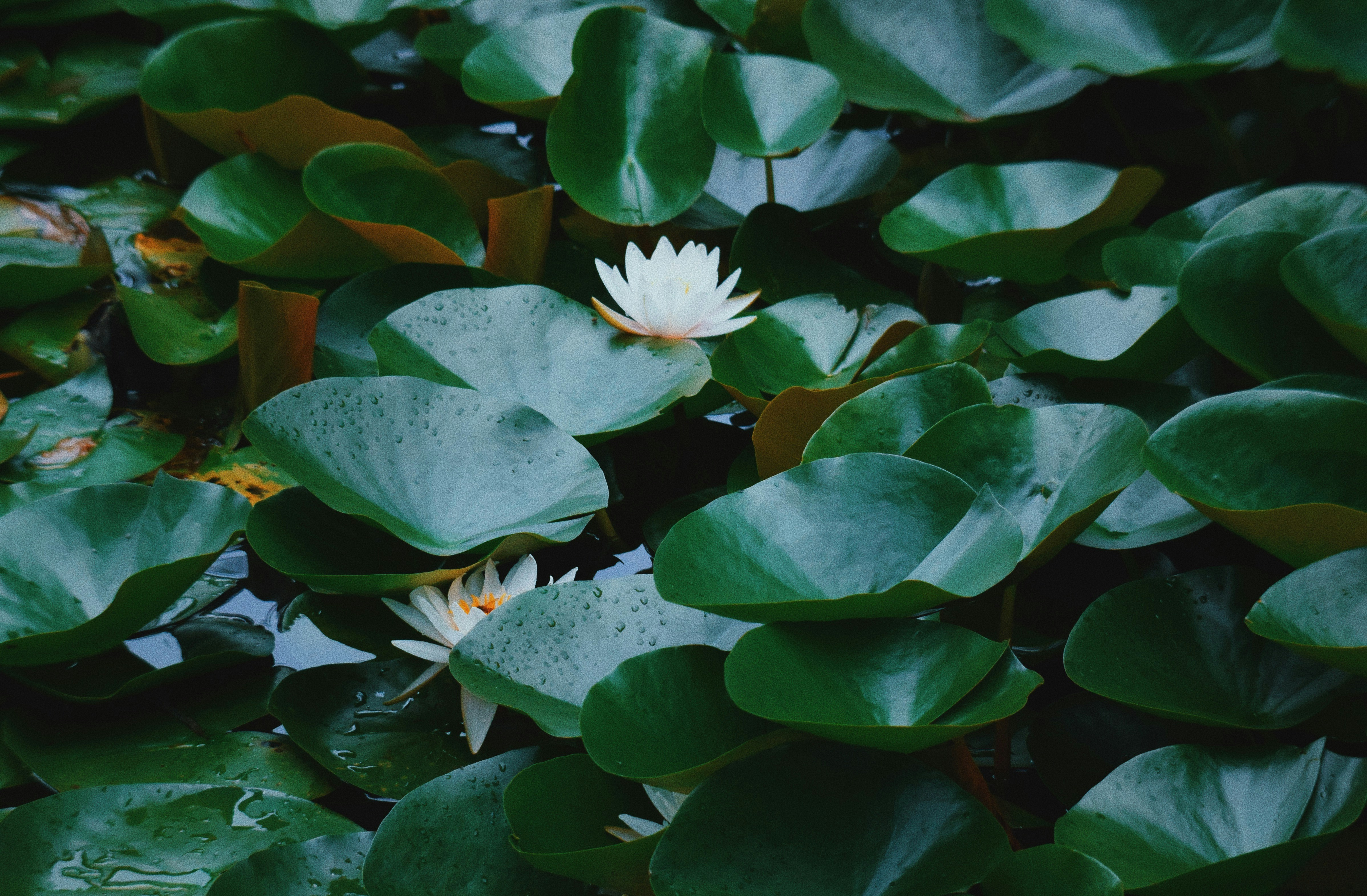 White Lotus Flower Growing From Lily Pads Photo Free Plant